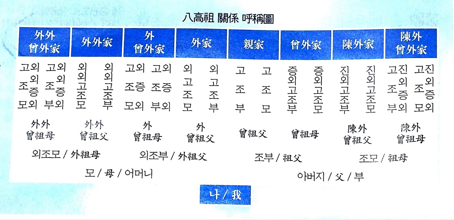 이상 8고조는 모두 나를 낳아 주신 혈족 4촌 이 되는 아주 가까운 16분의 고조부, 고조모이자 그의 자손들과는 성 씨가 달라도 모두 8촌으로 인척이 된다.